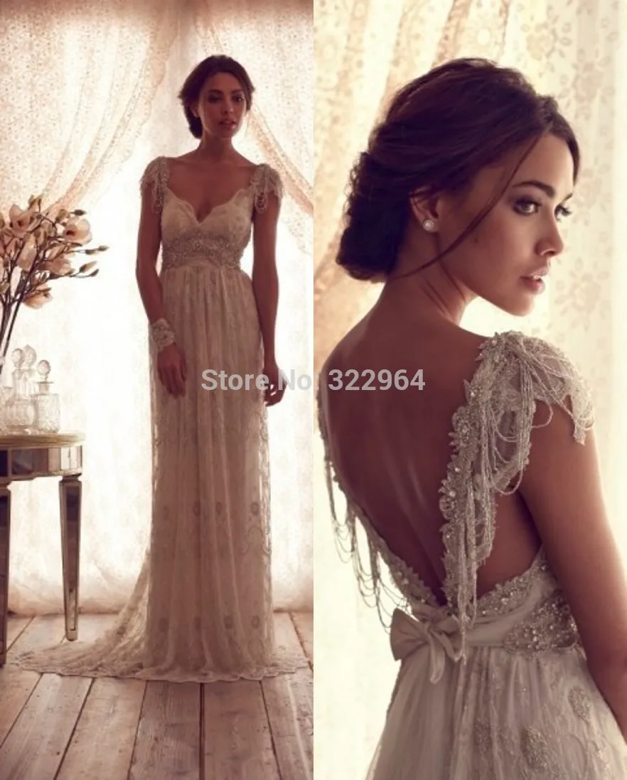 Luxury V Neck Anna Campbell Wedding Dresses Lace Crystal Beaded
