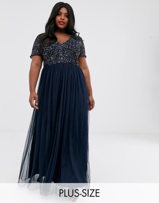 Maya Plus V Neck Maxi Tulle Dress With Tonal Delicate Sequins In