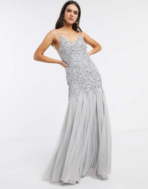 Maya Strappy Delicate Sequin Fishtail Maxi Dress In Silver Asos