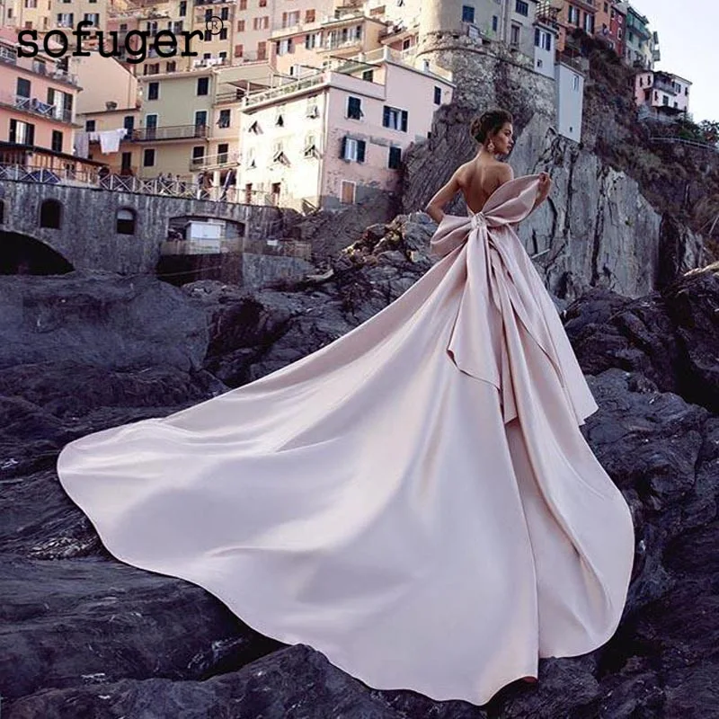 Blush Wedding Dresses Strapless Big Bow Prncess Satin Big Train