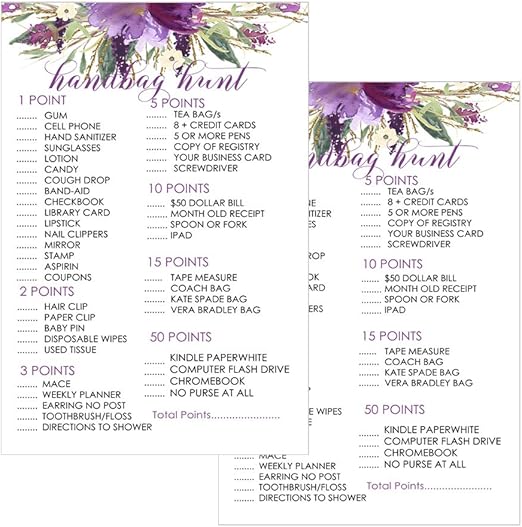 Amazon Com Purple Floral Bridal Shower Purse Game Pack 25 Cards Baby Shower Hunt Girls Sprinkle Activity Rustic Party Supplies Kitchen Dining