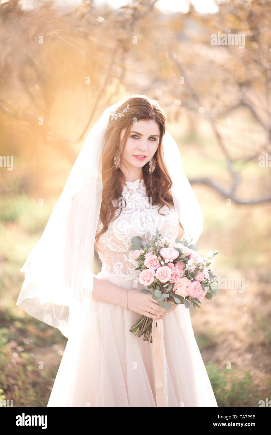 Beautiful Bride Holding Bridal Bouquet Standing Outdoors Looking At Camera Wedding Day Celebration 20s Stock Photo Alamy