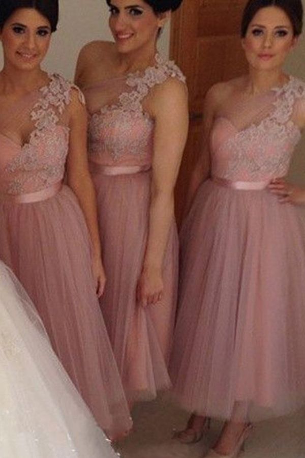 Best Short Pink Lace One Shoulder A Line Bridesmaid Dresses Tea