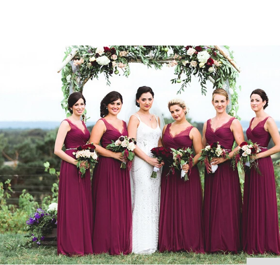 2017 Cheap Chiffon Burgundy Bridesmaid Dresses Long V Neck Lace Beach Pleated Floor Length Wedding Bridesmaids Dresses Burgundy Bridesmaid Dresses Bridesmaid