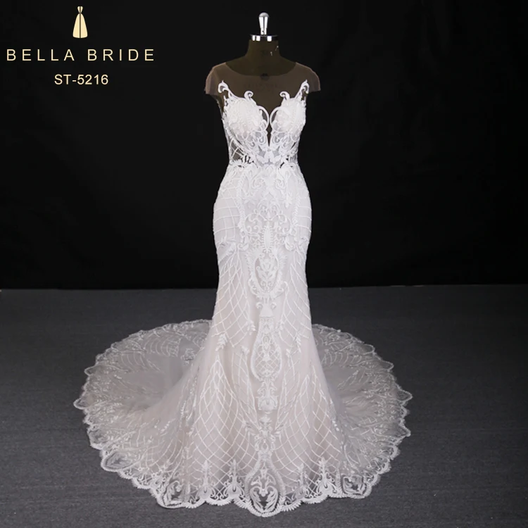 White Mermaid Tulle Lace Appliques Cap Sleeve Wedding Dress 2020