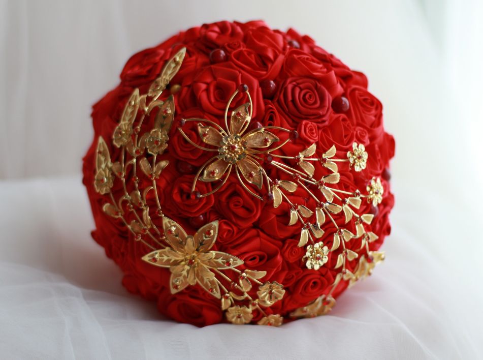 Wedding Bridal Bouquet Chinese Style Red Rose Gold Bouquet Red