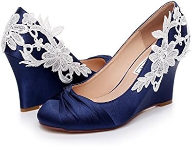 Luxveer Dark Blue Wedding Wedges With Lace Ivory Medium Heels