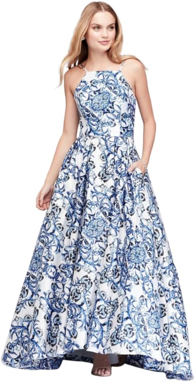 David S Bridal Printed Satin Halter Prom Ball Gown With Lace Up