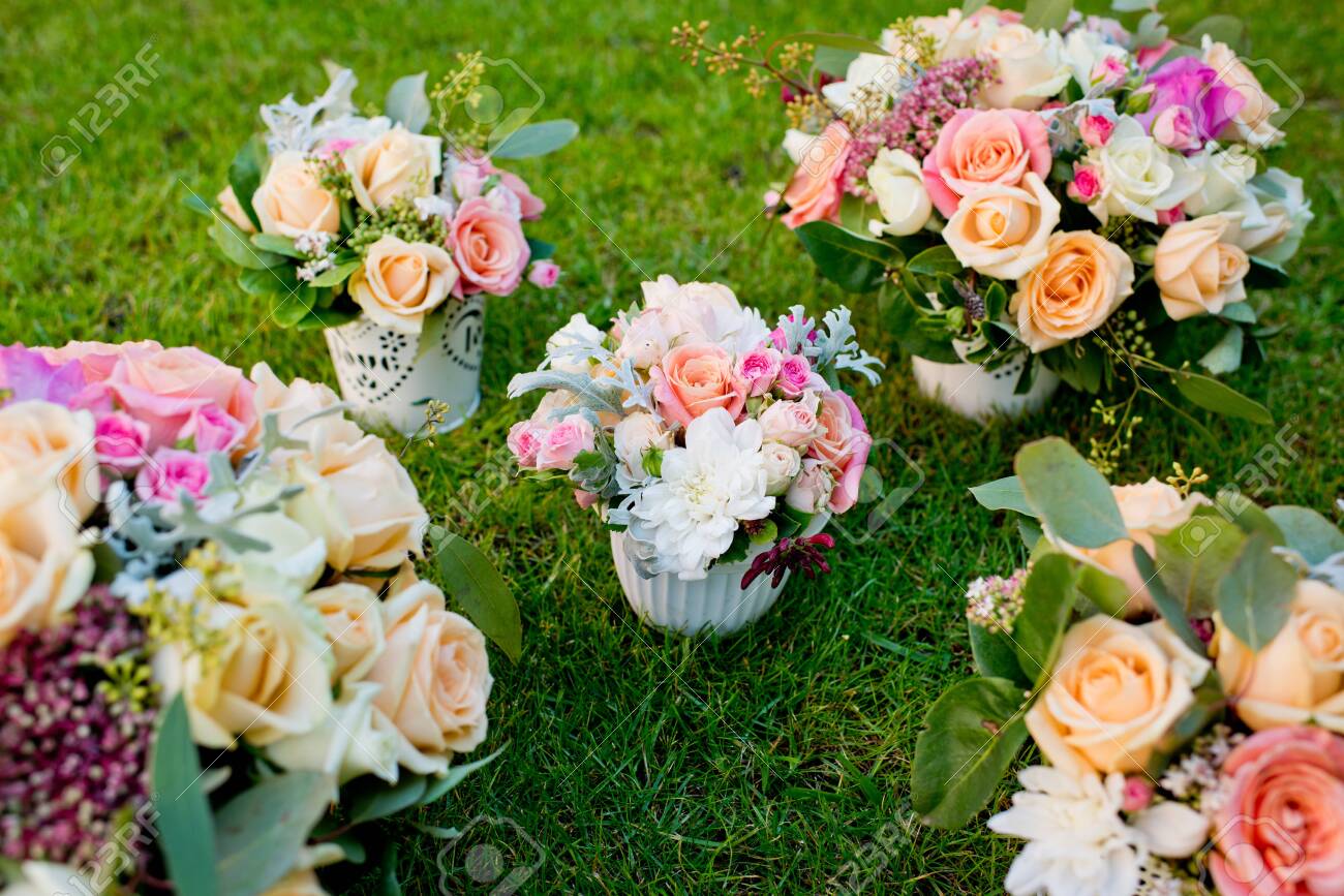 Five Different Wedding Bouquets On A Green Grass Stock Photo