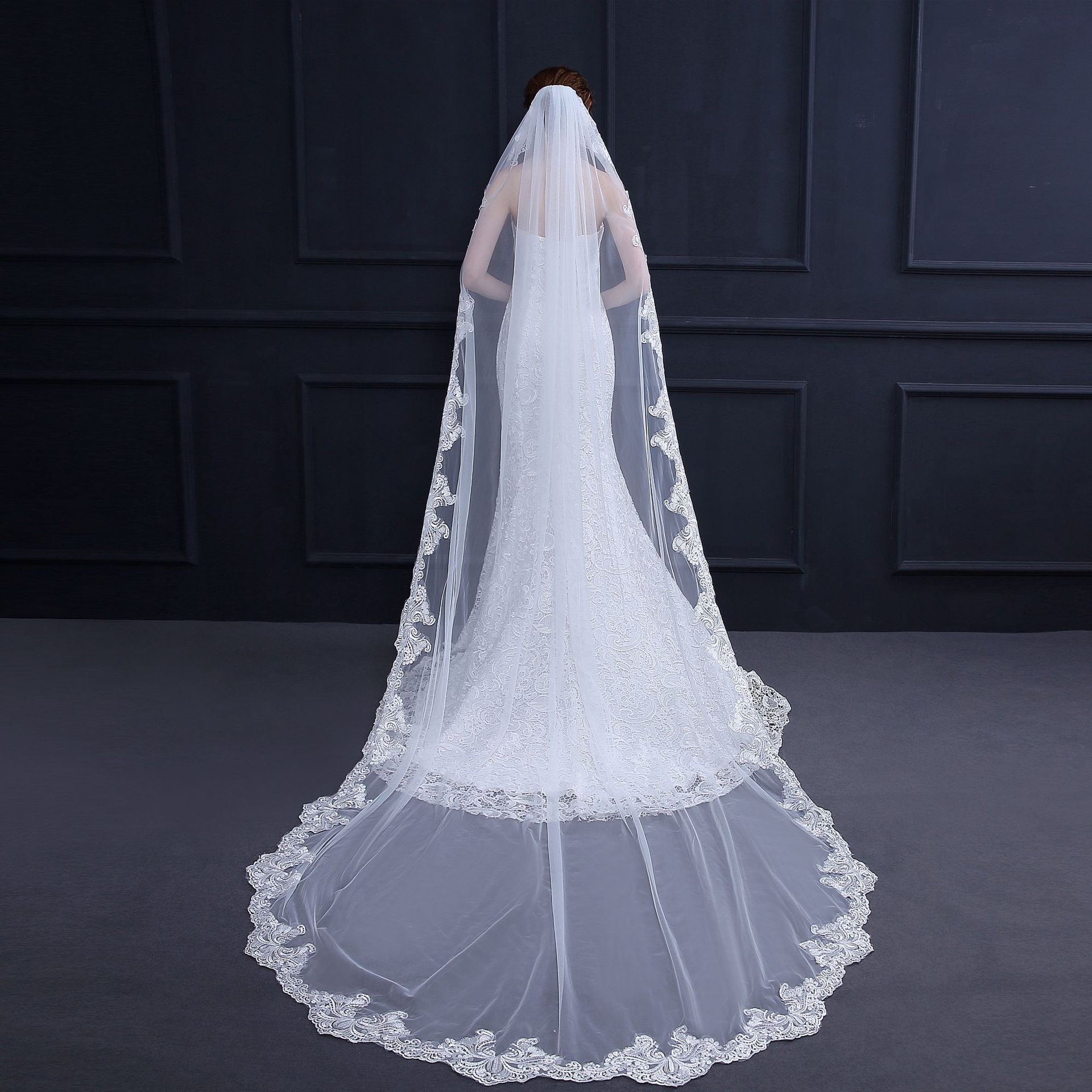 Ivory Cathedral Length Wedding Veils With Comb Applique Egde One