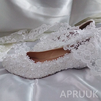 2cm Low Wedges Tiny Heel Plus Sizes White Lace Pearls Wedding Shoe