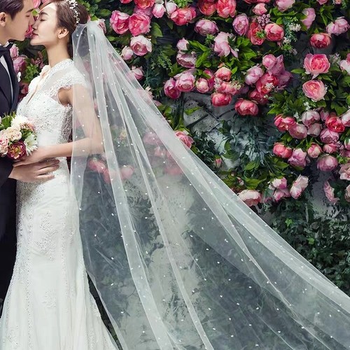 Luxury Cathedral Length Wedding Veil Pearls 1 Layer Bridal