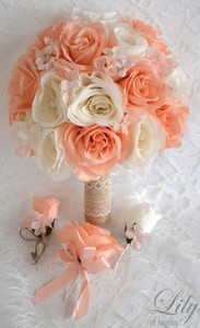 17 Piece Package Silk Flower Wedding Bridal Bouquet Peach Blush