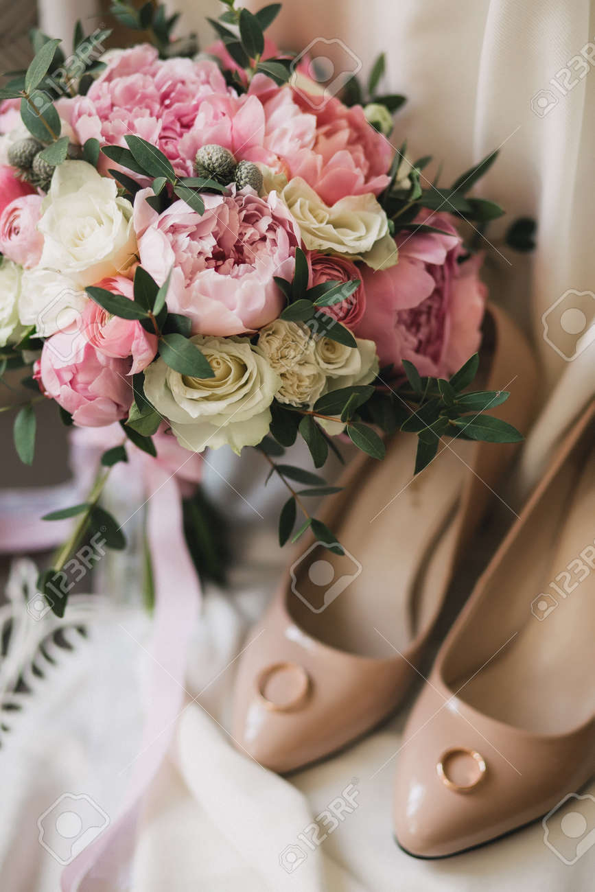 A Wedding Bouquet In Pastel Colors Consisting Of Roses Peonies