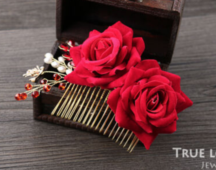 Red Rose Flower Bridal Beads Rhinestone Comb Wedding Hair Head