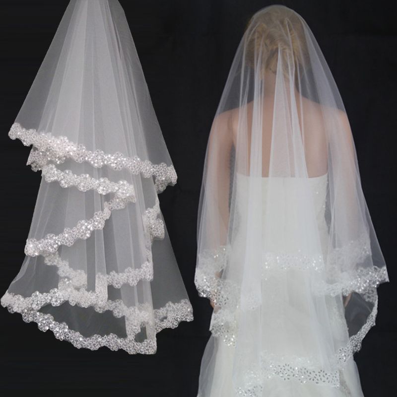 Fashion Sequins Applique Lace Bridal Veils White Ivory Long Lace