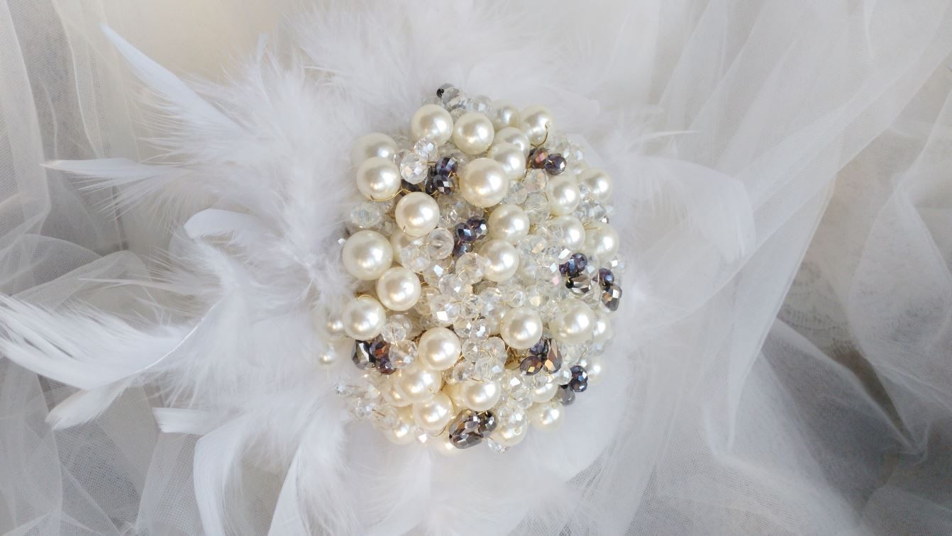 Custom White Feather Wedding Bouquet Pearl Crystal Bride