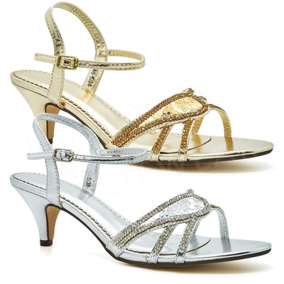 New Womens Diamante Low Kitten Heels Strappy Sandals Ladies Bridal