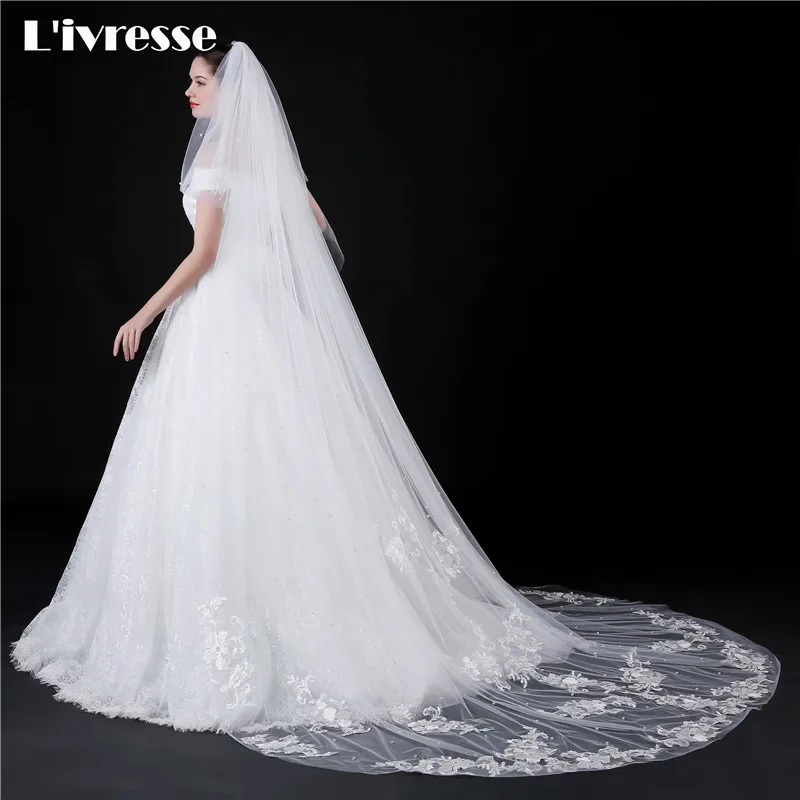 2 Layers Cathedral Wedding Veil With Comb Appliques Edge Pearls