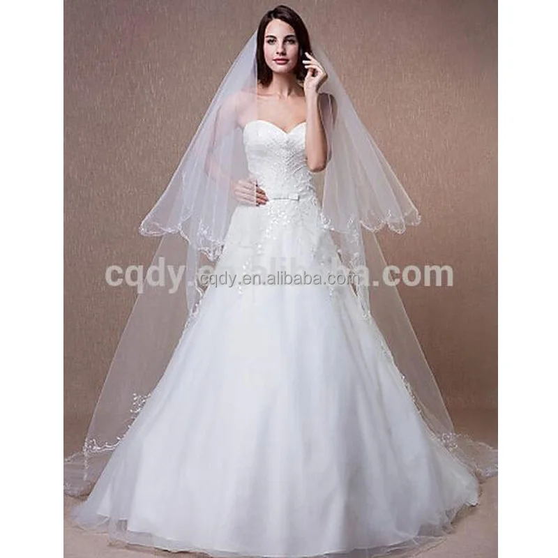 2015 Hot Sale Long Tulle Applique Train Lace Cathedral Ivory Wedding Veil Pearl Beaded Floral Border Wedding Veil