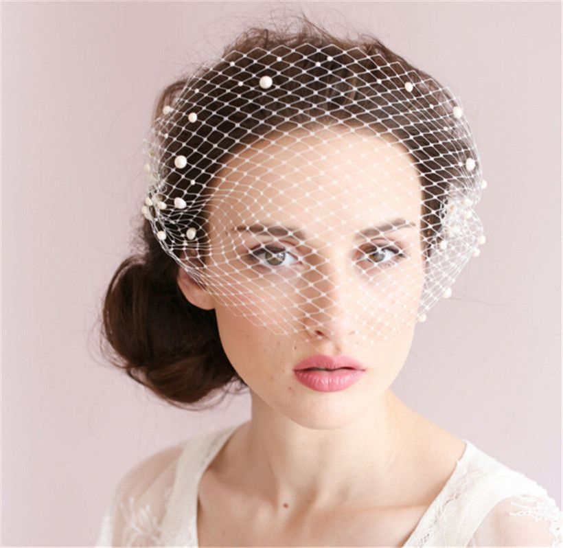 Vintage Wedding Bridal White Birdcage Veil Face Net Pearl Beaded