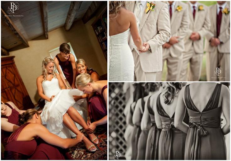 Bridesmaids In Wine Colored Long Dresses Help Bride Put On Bridal